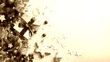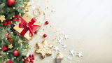 Christmas light background with beautiful golden gift decorated with fir branches, top view.