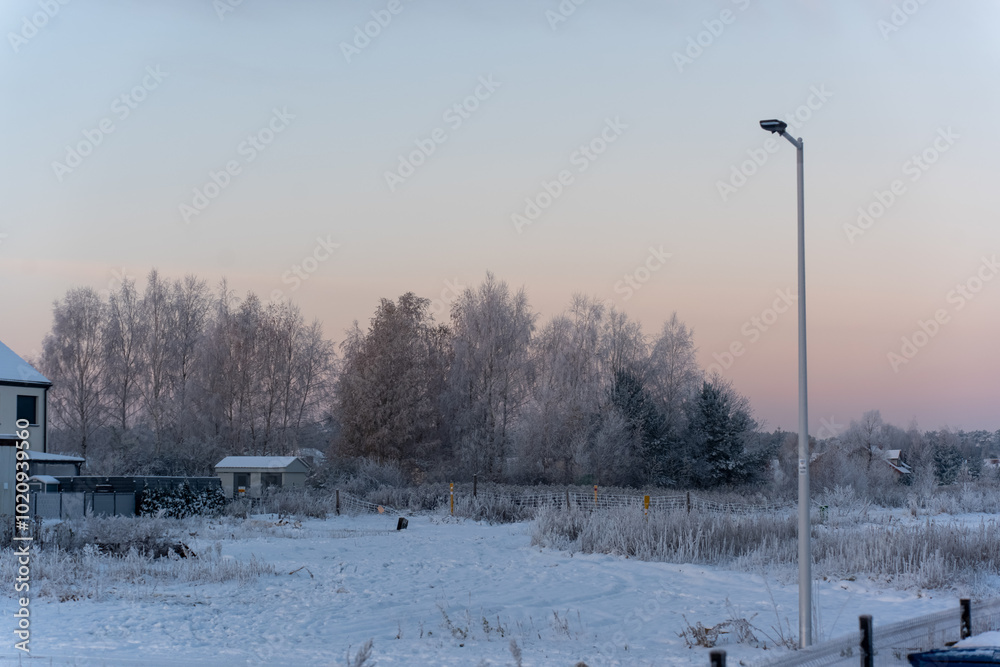 Winter landscape of a village covered in snow. Serene and peaceful scene of snow-blanketed houses, trees, and streets, showcasing the beauty of rural life during the cold season. High quality photo
