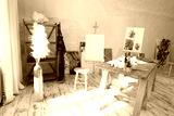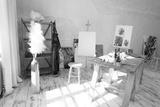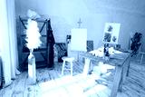 This bright art studio features a large table, a comfy chair, and colorful artwork, fostering creativity