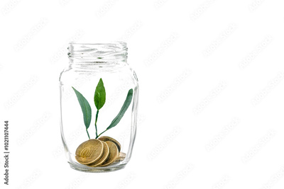 Glass jar with plant sprout inside and coins on transparent background. Money growth and storage concept