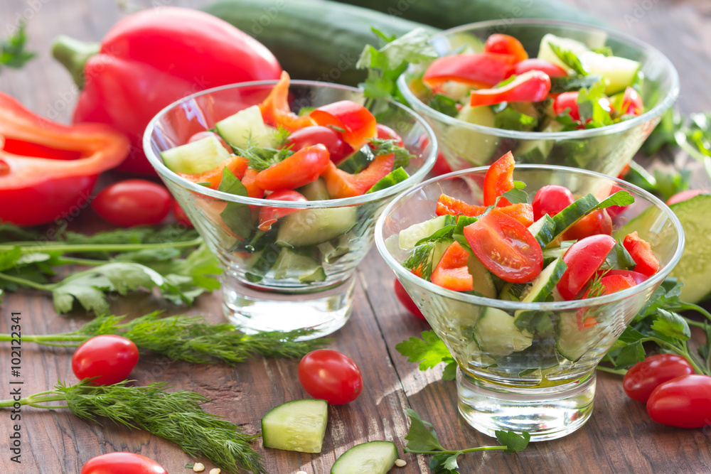 Three glass bowls with a salad of fresh vegetables and ingredients - tomato, cucumber, bell pepper on a dark wooden background