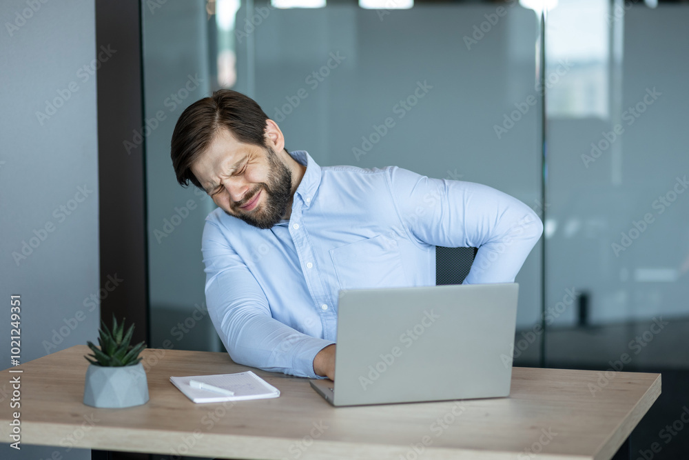 Man experiencing back pain while working at a desk