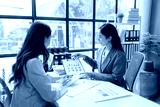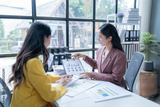 Two businesswomen are discussing financial data analyzing charts and graphs while having a meeting at the office. They are using a calculator for their accounting work