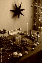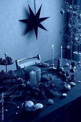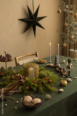 Interior design of warm dining room with table, wreath, christmas tree, green tablecloth, stylish chair, glasses candle with candlestick, brown wall and personal accessories. Home decor. Template.