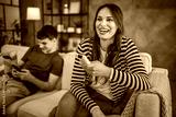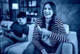 Young couple girlfriend watch movie while boyfriend use cellphone