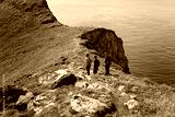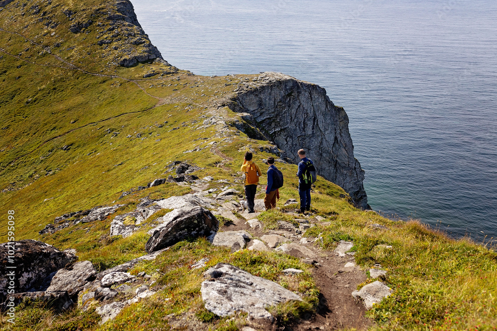 Family with kids and dog, hiking in Vaeroya island, the most famous hike Haen, children enjoying hiking on a sunny day