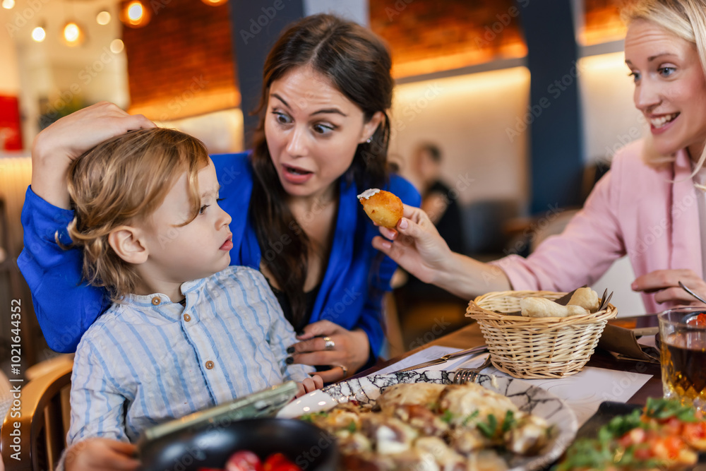 Family and friends gathered in a restaurant to eat delicious food, talk, drink and hang out.
