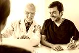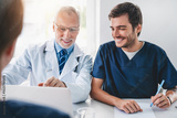 Senior doctor professional showing information on laptop to his colleague in hospital board room