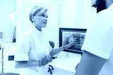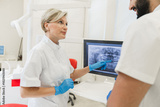 Two stomatologists orthodontists dentists looking at the x-ray photo at computer screen, discussing diagnosis in dental hospital clinic.