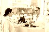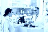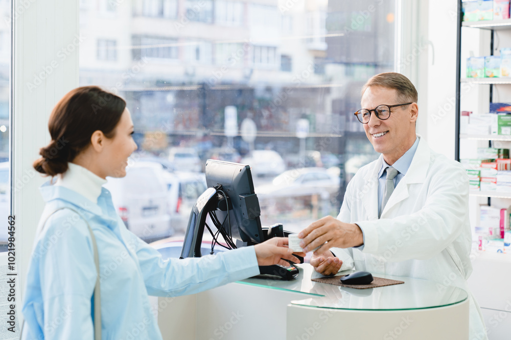 Caucasian male pharmacist druggist talking about new medicines pills remedies, side effects with a female customer patient holding a jar container. Pharmacy consultation