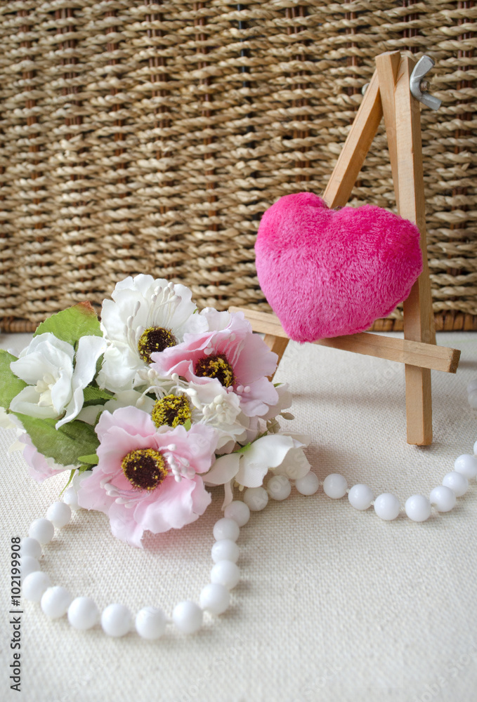 Textile pink heart, flower and necklace on brown wickered background. Card for Valentine's day
