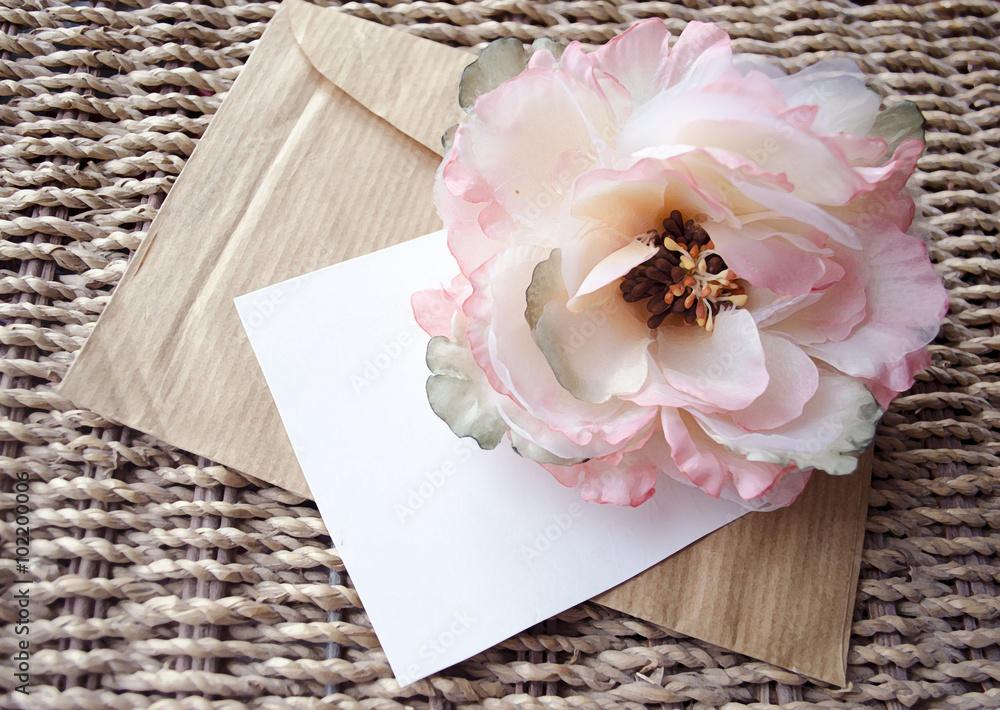Beautiful blooming bud of flower on a brown paper and wickered background