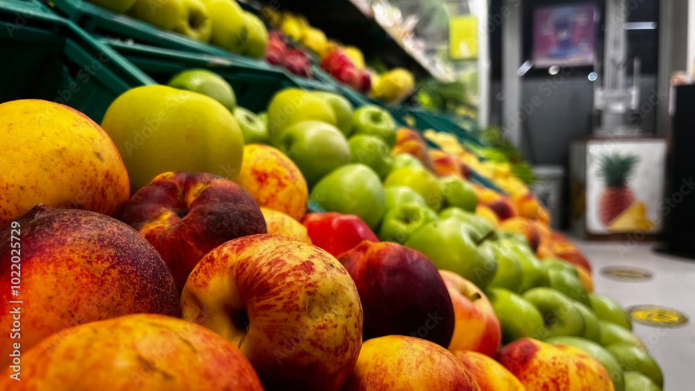 Fresh fruit and vegetables in the aisle at the market.