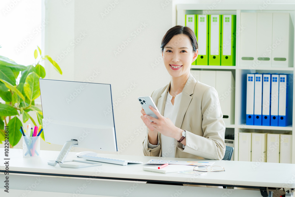 オフィスでスマホを持つキャリアウーマン