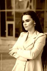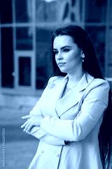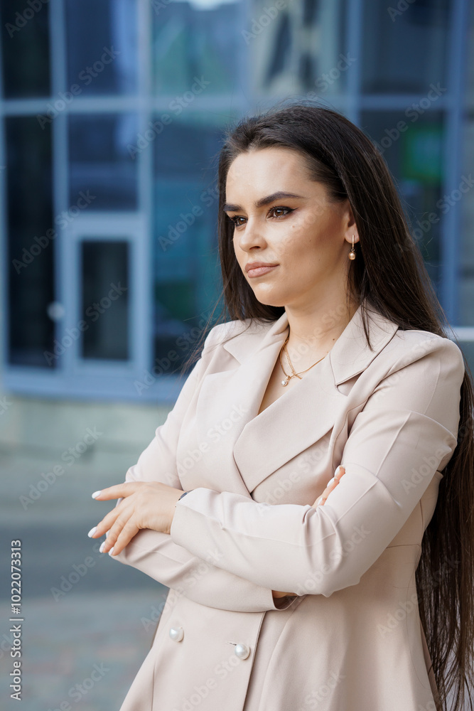 Confident Young Woman with Long Dark Hair in Elegant Blazer Captured Outdoors