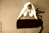An aikidoka girl folding her hakama for Aikido training, sitting on tatami