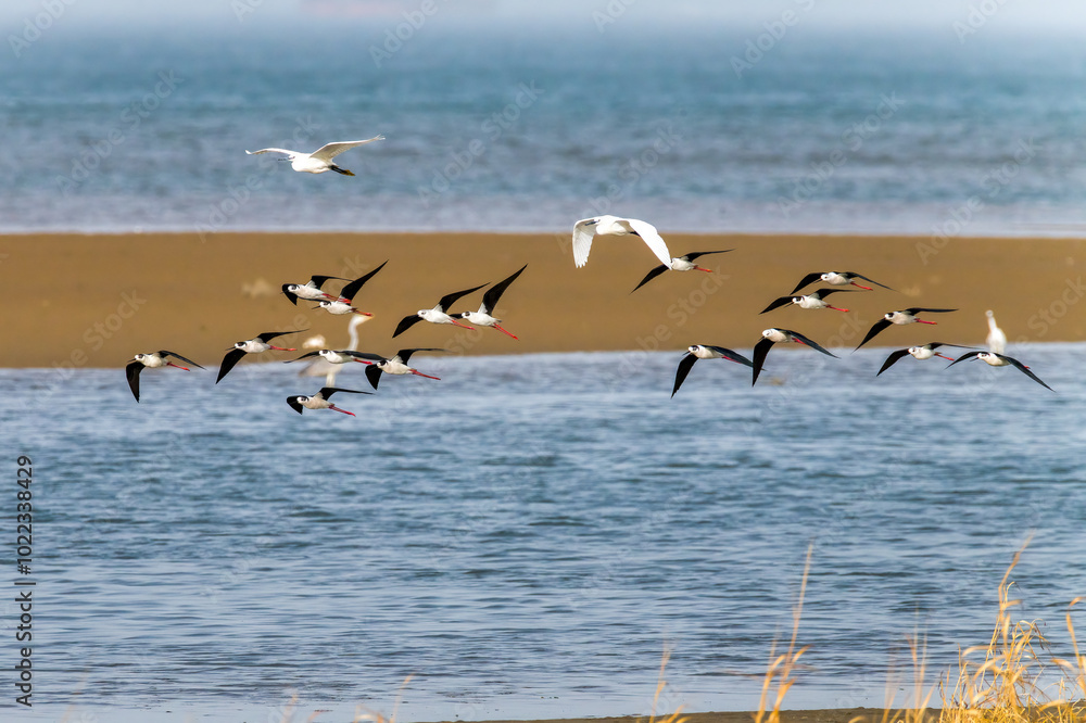 Black-winged longlegged Snipe group in Beidaihe coastal wetland, Qinhuangdao city, Hebei province, China.