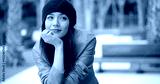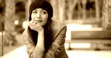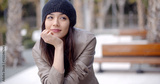Thoughtful serious trendy young woman sitting on a bench in an urban park with her chin on her hand and a contemplative expression