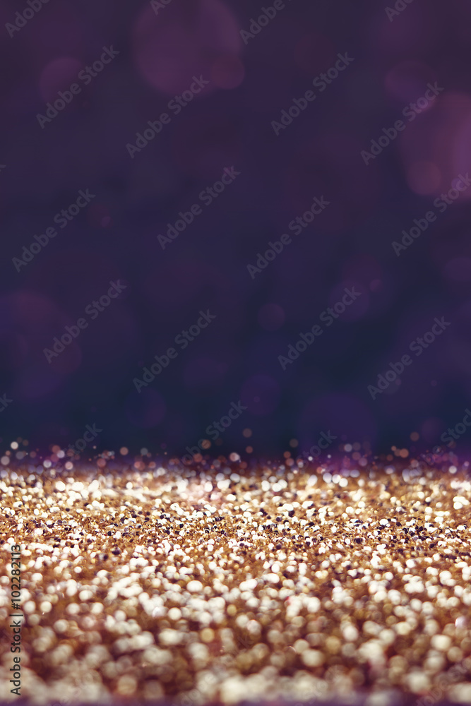 Vintage filter, Gold glitter floor with purple bokeh background,