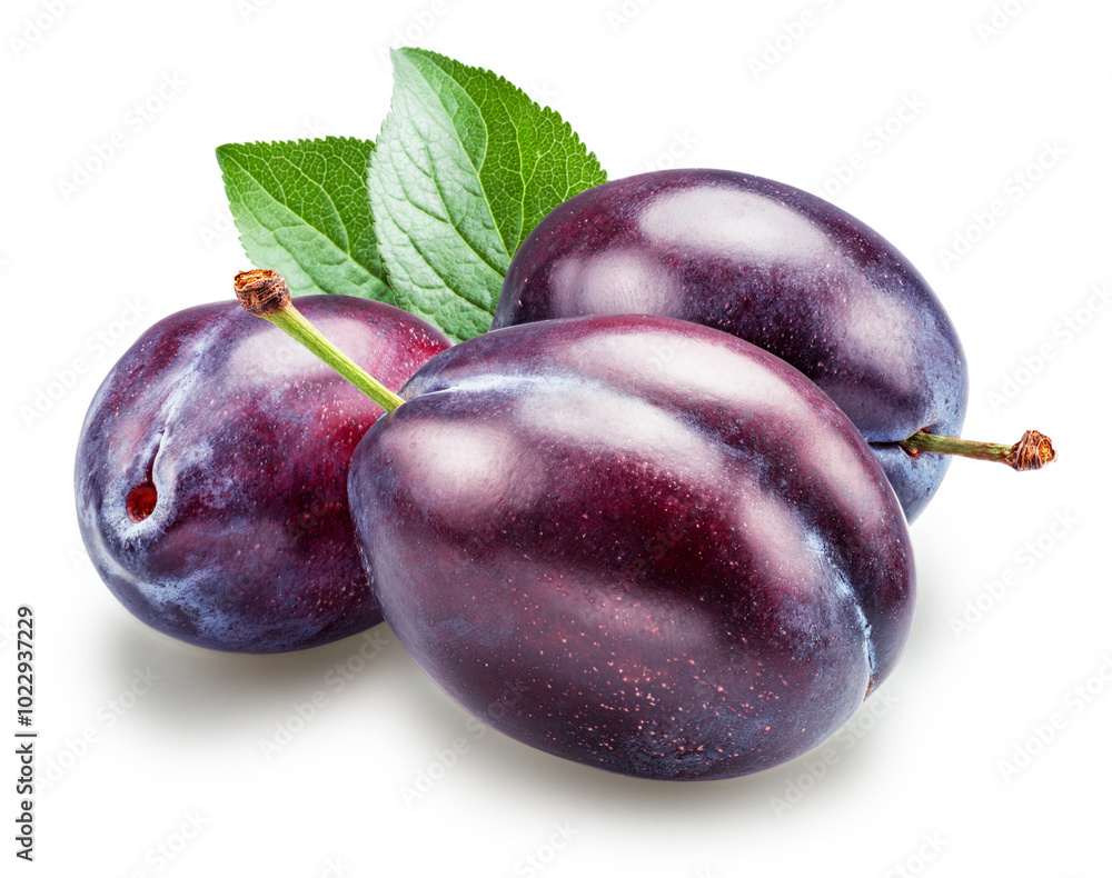 Ripe prune plums with green leaf isolated on white background. Clipping path.