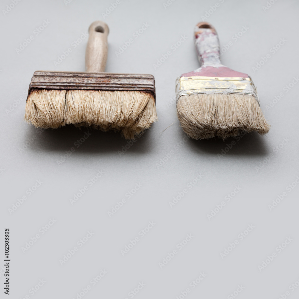 Pair of used, aged paintbrushes on gray background. Painter brush texture, macro view, copy space
