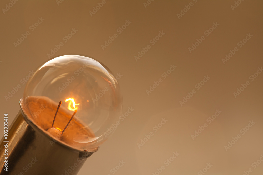 Glowing light bulb on gold brown background. Retro style lamp with ideal spherical surface and filament element. Macro view, copy space
