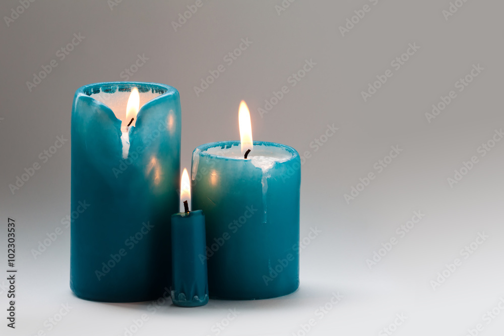 Three turquoise candles with a burning wick. Different size candles, motion flame. Family day concept. Gradient background. copy space, macro view. Soft focus.