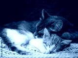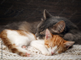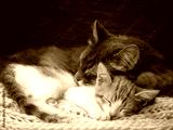 Mother and baby. Portrait of a big cat. Most mom sleeps with little kitten