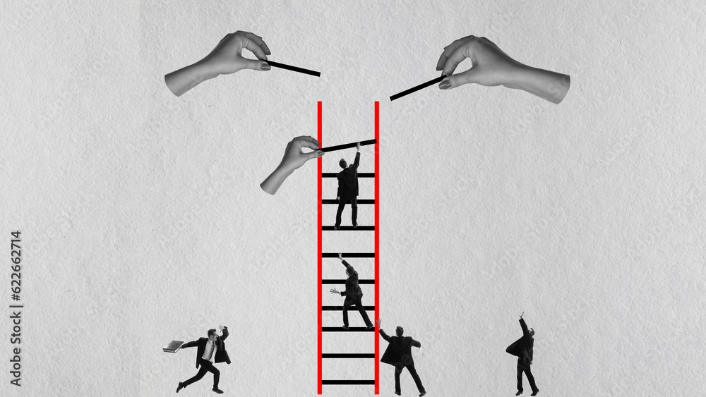 Man with prosthetic leg pointing upwards, symbolizing ambition and pursuit of goals. Overcoming challenges in a supportive work environment. Concept of business, dei, equality, support