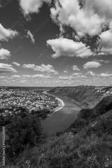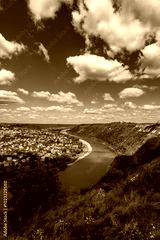 Serene Aerial View of a Winding River Surrounded by Lush Green Hills and a Quaint Town Under a Cloudy Sky