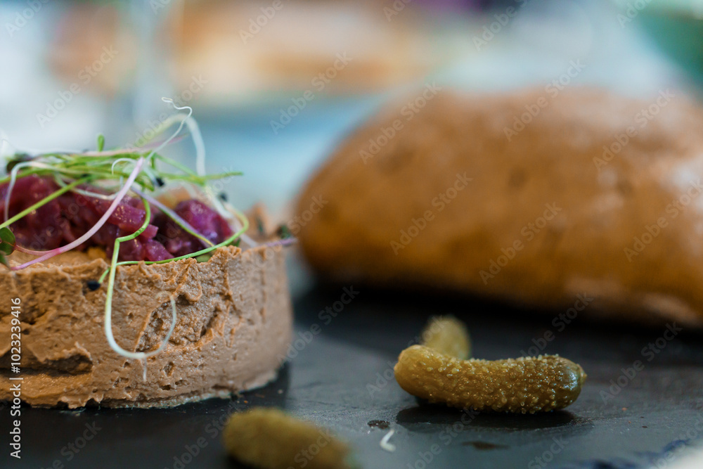 Gourmet Beef Tartare with Microgreens and Homemade Bread on Rustic Slate Platter