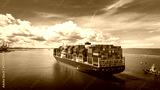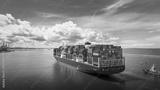 Stern view of Cargo container ship carrying container and running out international container port customs shipyard sea port concept smart logistic service..