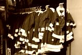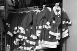 Christmas and New Year holidays. Christmas shop windows with children's Santa Claus costumes on hangers for holiday decor