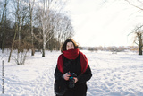 A smiling woman with a red scarf enjoys a snowy winter day in a serene forest setting beneath a bright blue sky. Christmas and New Year celebration concept.