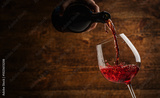 Pouring red wine into the glass on rustic dark background. Pour alcohol, winery concept.