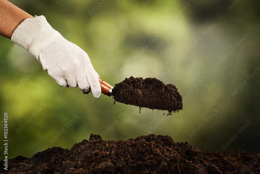 Planting a small plant on a pile of soil on green bokeh backgrou