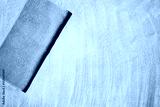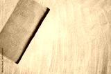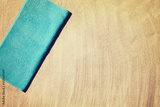 Top view photograph of sandy beach with summer accessories and copy space around objects. Horizontal photo taken from above with visible sand texture. Vintage, retro effect processing.
