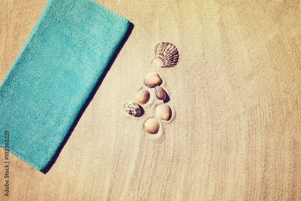 Top view photograph of sandy beach with summer accessories and copy space around objects. Horizontal photo taken from above with visible sand texture. Vintage, retro effect processing.