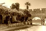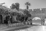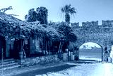 Picturesque Virgin Mary Gate in Rhodes Old Town with a medieval stone arch, vibrant bougainvillea, and a stunning coastal view of the Mediterranean Sea.
