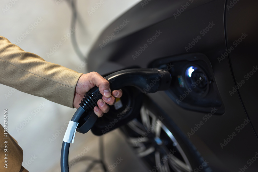 Young businessman at the charging station holding a plug to charge his electric car. Eco electric car concept