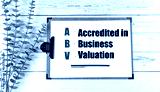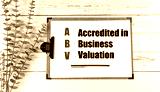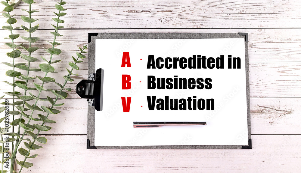 ABV acronym meaning accredited in business valuation on a clipboard with pen and green plant on white wooden background