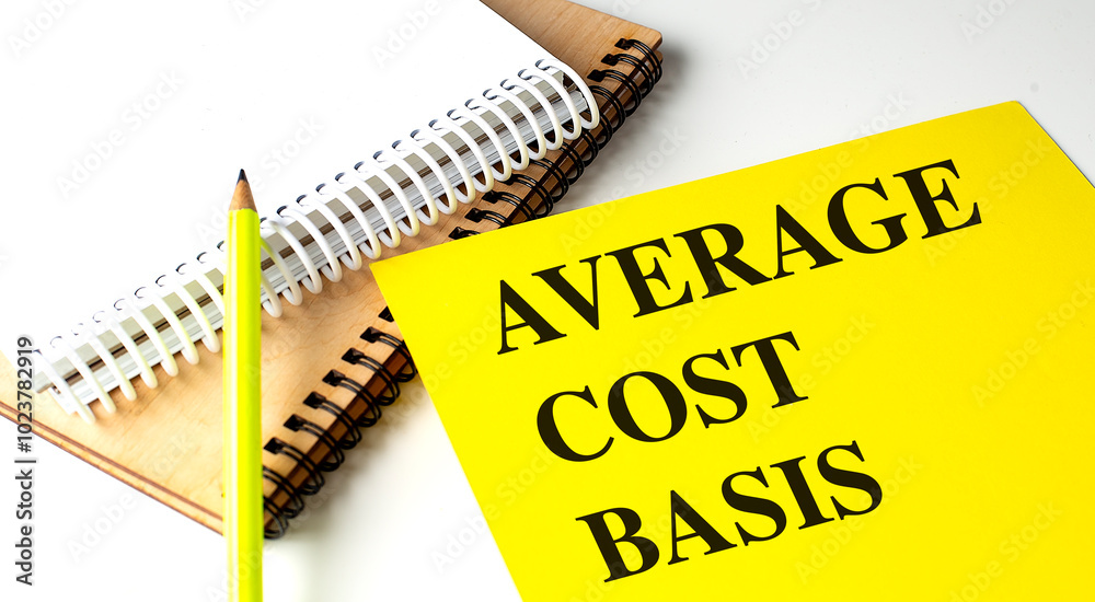 Average cost basis text on yellow folder with spiral notebooks and pencil on white desk