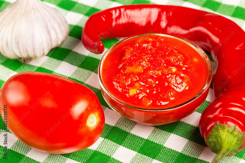 adjika in a glass bowl garlic, tomato, hot pepper and bell pepper
