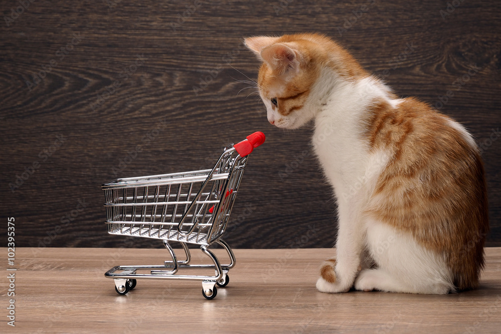 Grocery supermarket trolley and kitten. Concept - pet products, supermarket or Internet service