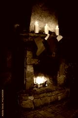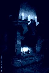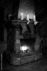 Christmas stocking on fireplace background. Chimney place.