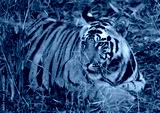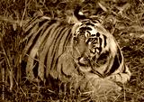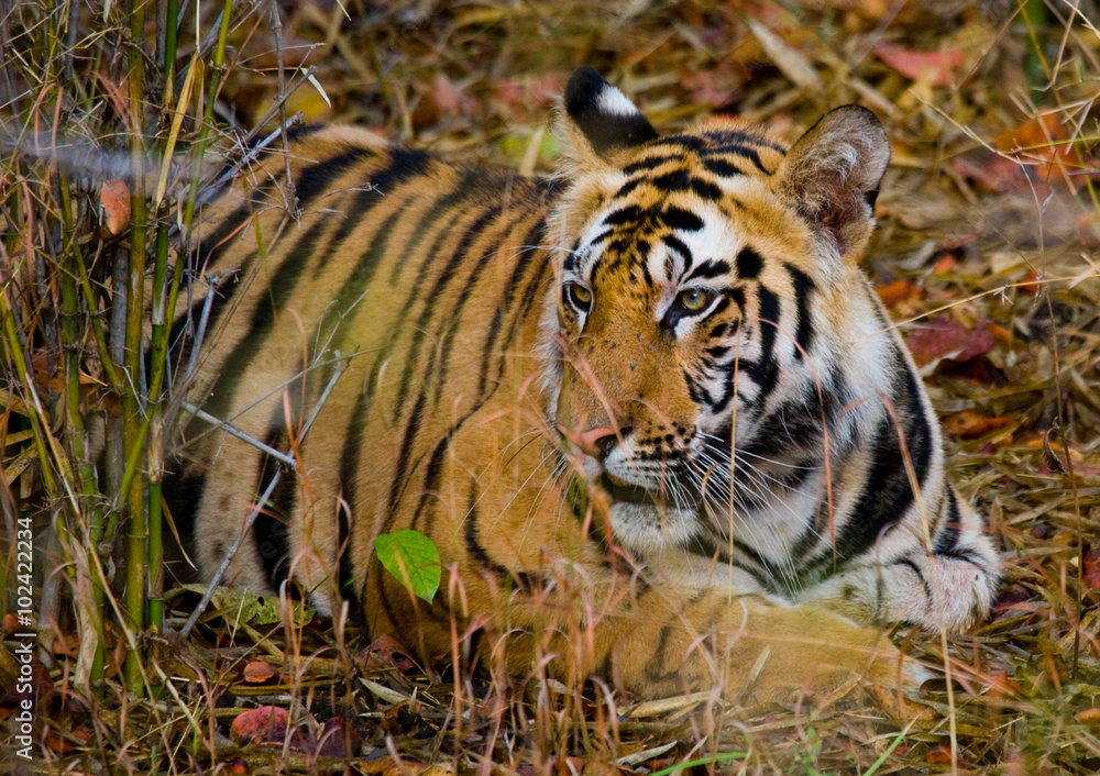 Wild tiger lying on the grass. India. Bandhavgarh National Park. Madhya Pradesh. An excellent illustration.