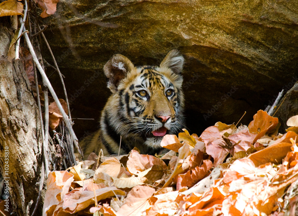 Wild cub Bengal tiger looks out from rocks in the jungle. India. Bandhavgarh National Park. Madhya Pradesh. An excellent illustration.