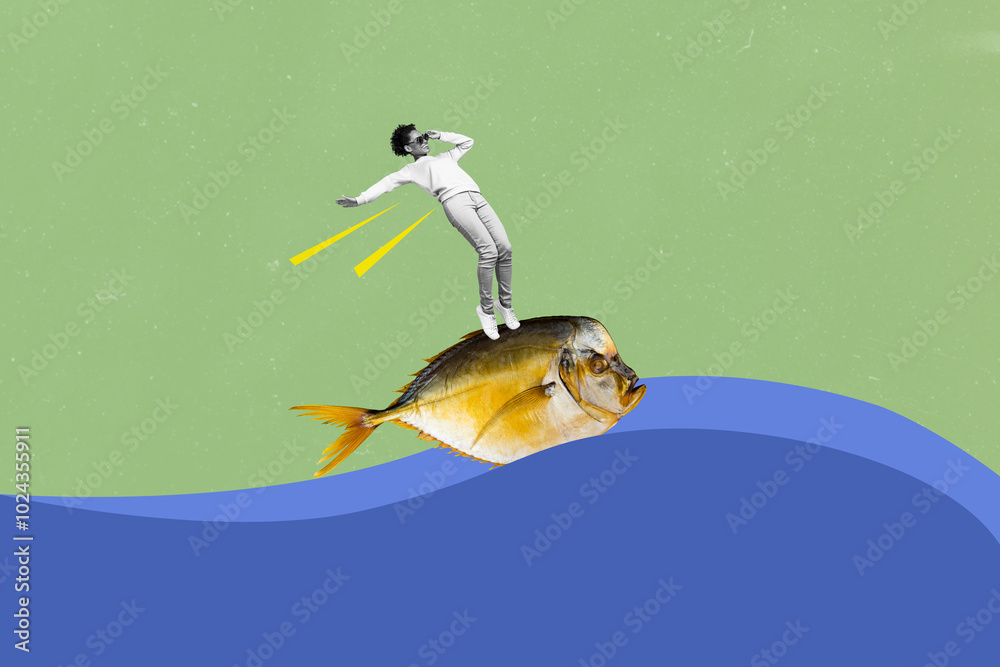 Composite photo collage of happy american girl ride dorado fish summer ocean travel fresh meal fishing isolated on painted background