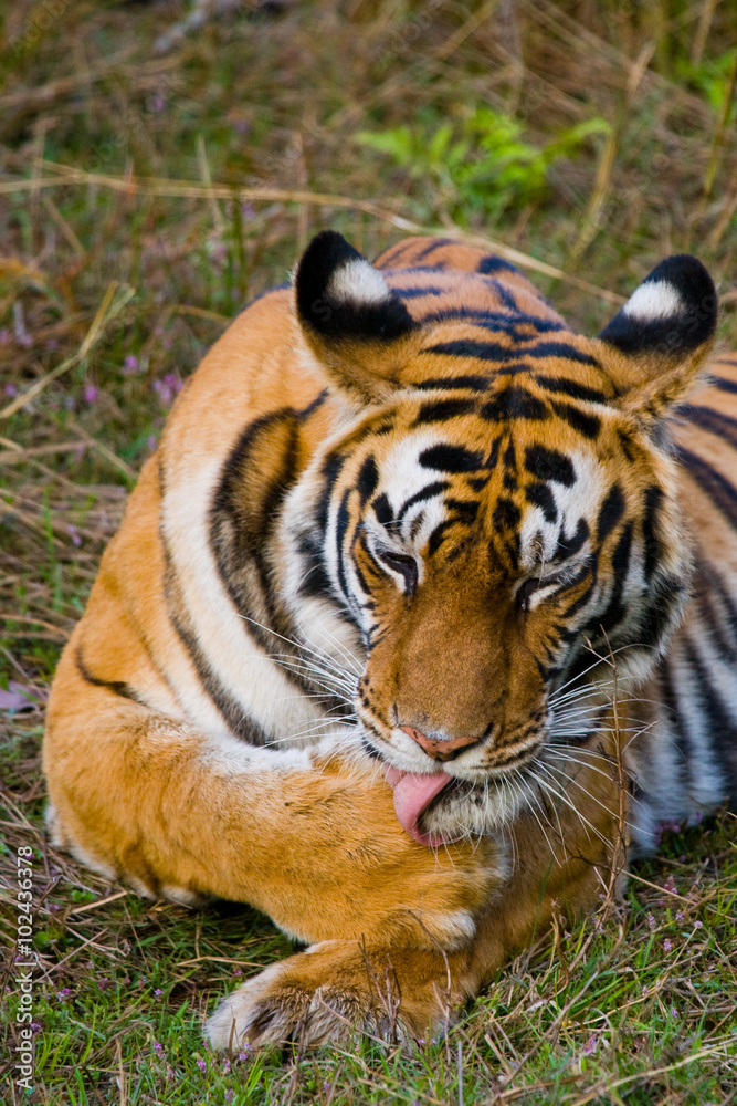 Wild tiger lying on the grass. India. Bandhavgarh National Park. Madhya Pradesh. An excellent illustration.