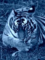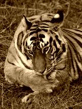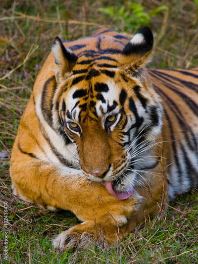 Wild tiger lying on the grass. India. Bandhavgarh National Park. Madhya Pradesh. An excellent illustration.